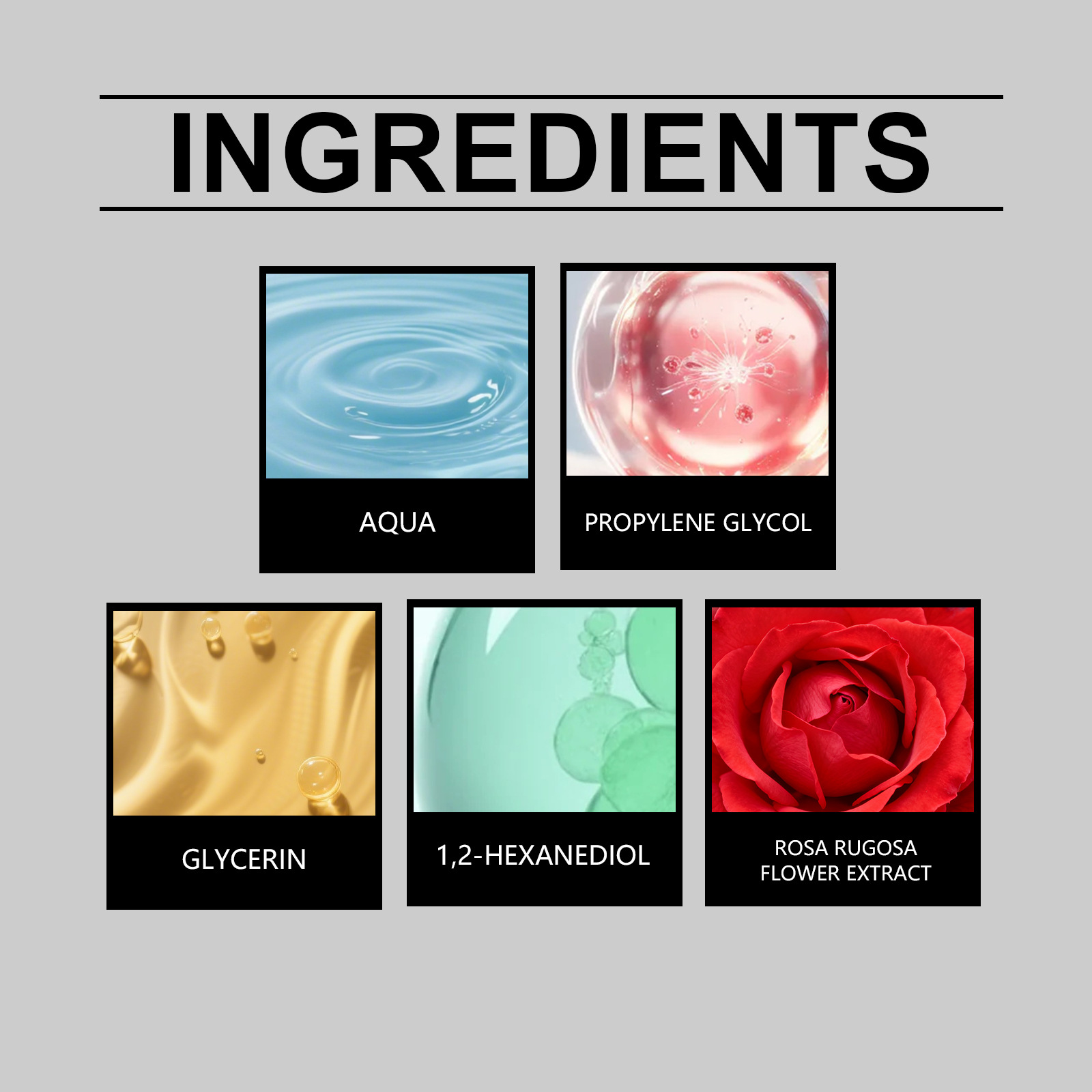 Ingredients: water, propylene glycol, glycerin, 1,2-hexanediol, rose extract.